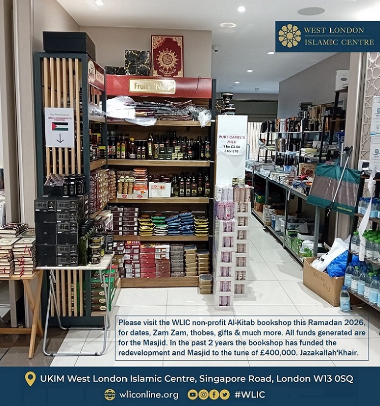 Please visit the WLIC non-profit Al-Kitab bookshop this Ramadan, for dates, Zam Zam, thobes, gifts & much more. All funds generated are for the Masjid. In the past 2 years, with your support the bookshop has funded the redevelopment and Masjid to the tune of £400,000. Jazakallah’Khair.