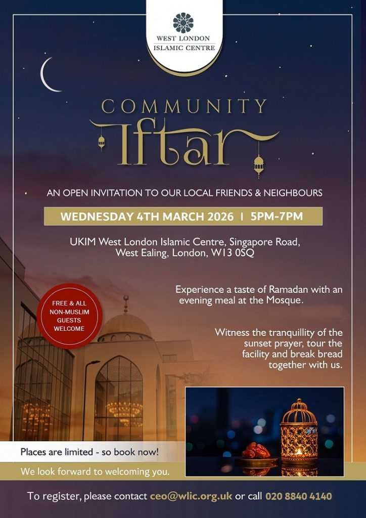 Community Iftar Wed 4th March: All our neighbours and non-Muslim friends are invited to open fast with us in the Mosque, will include short presentations, tours and dinner, to register please email info@wlic.org.uk