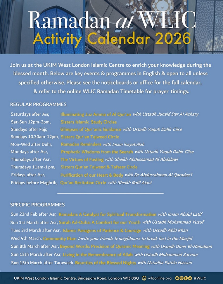 Please download the Centre Ramadan timetable here and the Centre’s Ramadan Activity Calendar 2026 here, we look forward to welcoming you for programmes and evening Taraweeh prayers. At WLIC 20 rakkah of Taraweeh is performed, if the centre is completely full and for safety, the gates closed, please wait until the first 8 rakkah of Taraweeh are complete at approximatley 8.30pm, space will then become available.